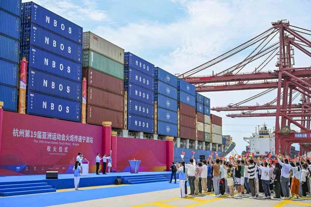 ↑這是杭州亞運(yùn)會(huì)火炬?zhèn)鬟f寧波站起跑儀式現(xiàn)場。