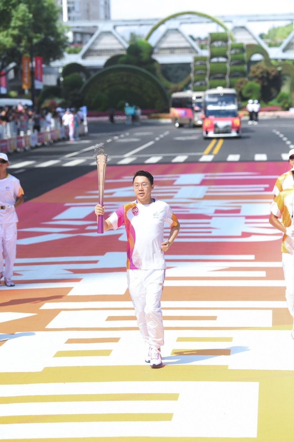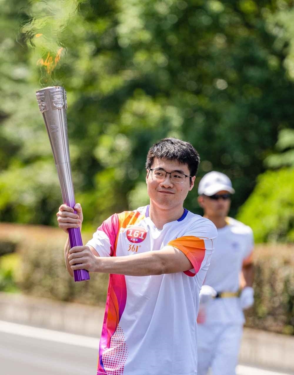 ↑火炬手王懿律在火炬?zhèn)鬟f中。