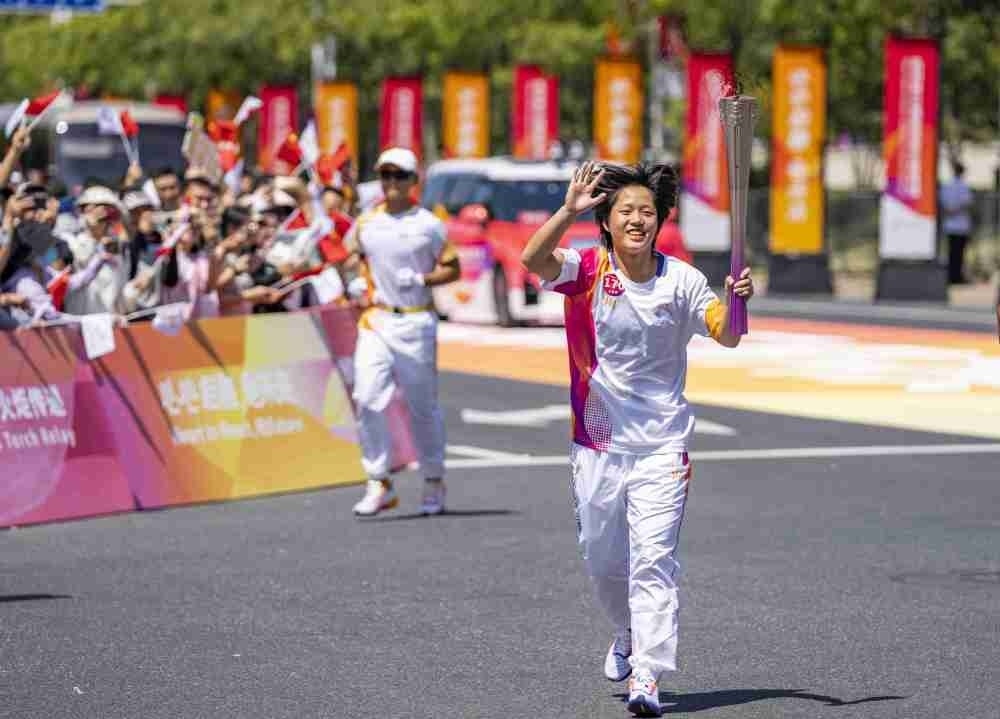 ↑火炬手成穎在火炬?zhèn)鬟f中。