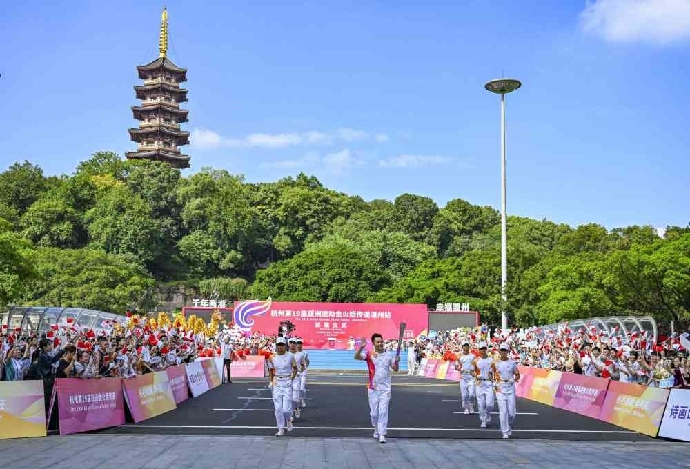 ↑這是杭州亞運(yùn)會(huì)火炬?zhèn)鬟f溫州站收火儀式現(xiàn)場。