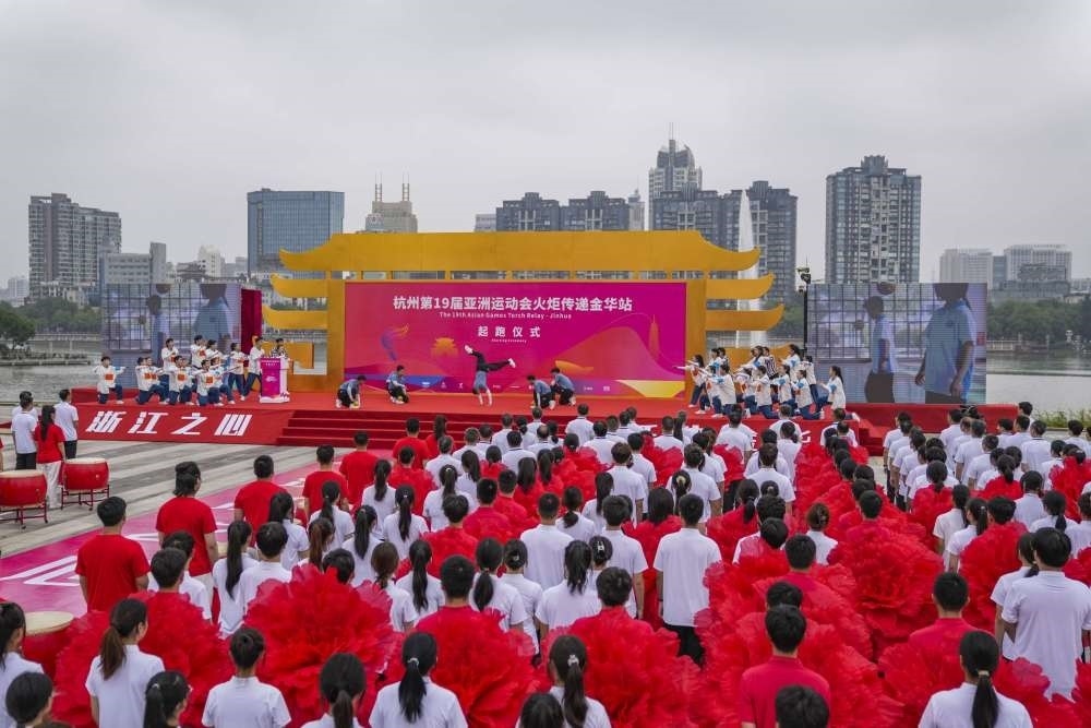 ↑這是杭州亞運(yùn)會(huì)火炬?zhèn)鬟f金華站起跑儀式現(xiàn)場。