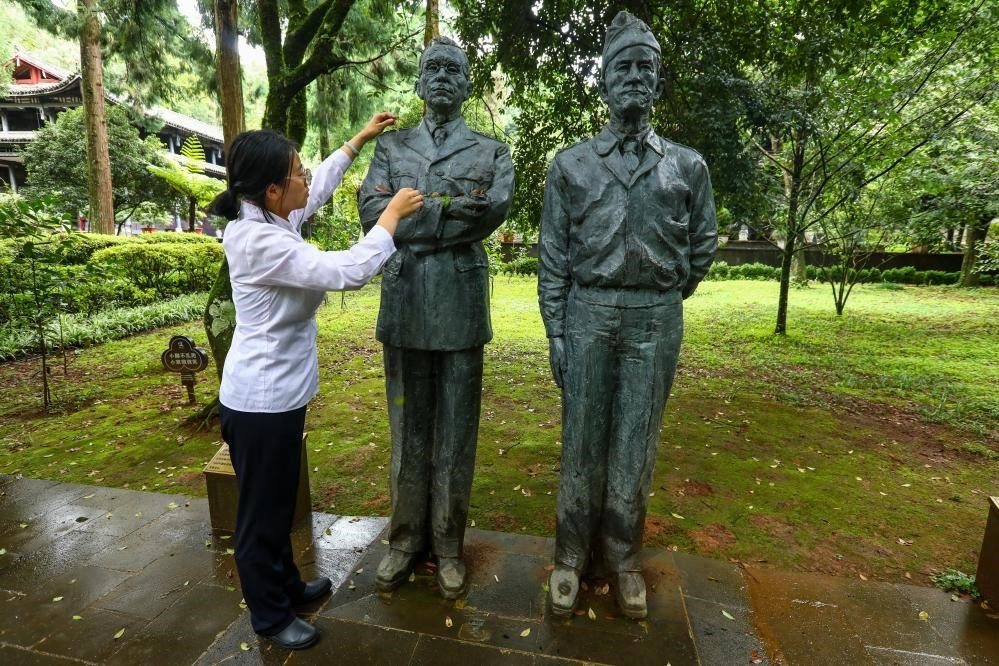 8月31日,在云南騰沖市國殤墓園內,工作人員為史迪威將軍雕像(左為史迪威、右為陳納德)清理落葉。
