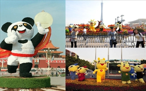 左圖:第11屆亞運(yùn)會(huì)吉祥物熊貓“盼盼”的造型;右上圖:人們?cè)诘?6屆亞運(yùn)會(huì)吉祥物“祥和如意樂(lè)洋洋”雕塑前拍照;右下圖:廣州亞運(yùn)會(huì)吉祥物造型花卉。資料照片