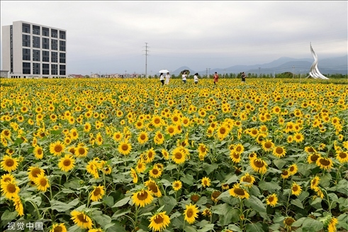 浙江金華,金東區(qū)東二環(huán)往金義快速路的東南側(cè),一大片向日葵迎來(lái)了盛開季。