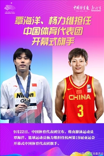 9月22日上午,中國(guó)體育代表團(tuán)宣布,將由游泳運(yùn)動(dòng)員覃海洋、籃球運(yùn)動(dòng)員楊力維擔(dān)任杭州亞運(yùn)會(huì)開幕式中國(guó)體育代表團(tuán)旗手。