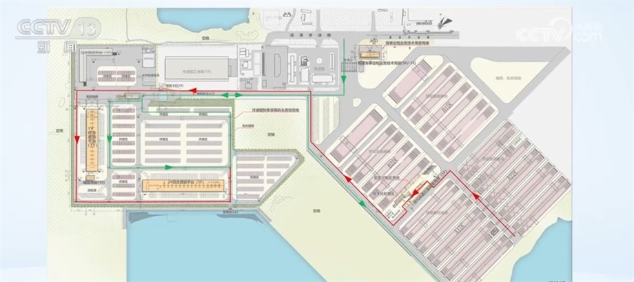 海南洋浦保稅港區(qū)發(fā)展局局長 張洪光:紅色的就是一線的流線,綠色的就是二線的流線,它們是不交叉的,如果需要查驗的話,它們是可以共用這個查驗平臺的。我做這樣的最終目的也是確保一線真正能夠放開,二線能夠真正管住。