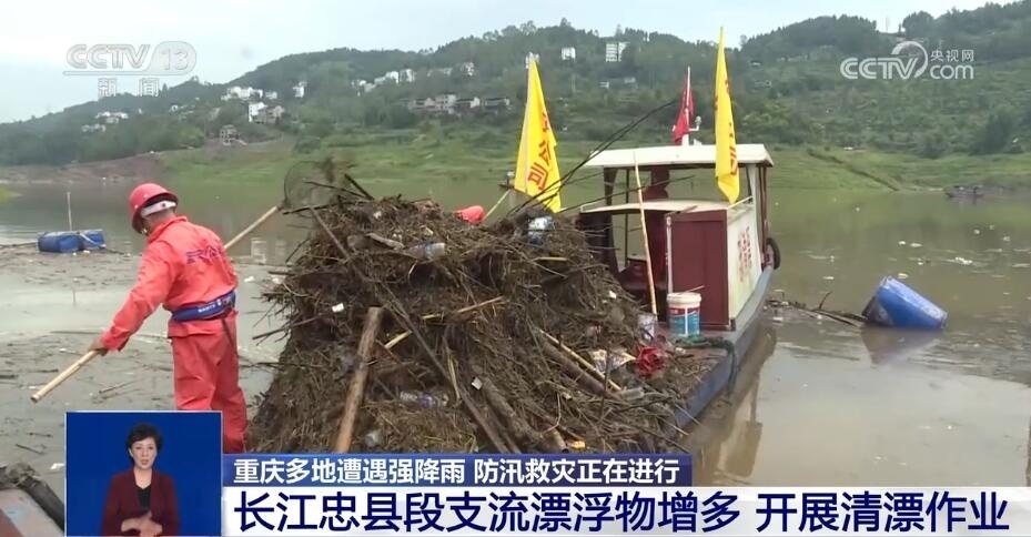 近段時間,重慶的強降雨天氣還導(dǎo)致長江重慶忠縣段各支流漂浮物增多。目前,多艘清漂船來回穿梭在江面上,分區(qū)域開展清漂作業(yè),清漂工人將江面漂浮物一一打撈上船,轉(zhuǎn)運上岸后再進(jìn)行集中處理。7月3日以來,忠縣累計出動人工打撈船次80余船次,累計打撈垃圾約400余噸。此外,此輪長江洪峰過境忠縣后,長江忠縣段水位迎來上漲,當(dāng)?shù)叵嚓P(guān)部門正密切關(guān)注水位變化。