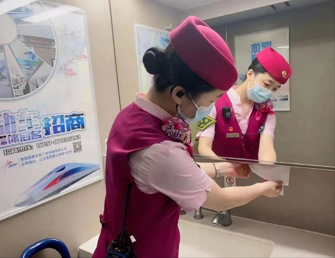 除了車身硬件的“美妝”,在列車上線始發(fā)前,列車乘務(wù)人員還要檢查各類客運服務(wù)備品、衛(wèi)生備品等是否準(zhǔn)備齊全。他們需要保證車座椅背后網(wǎng)兜清潔袋擺放整齊,小桌板統(tǒng)一收起,頭枕巾和椅套擺放平整、干凈、無污染。