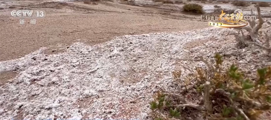 總臺(tái)記者 崔寧:你看這個(gè)鹽堿地長(zhǎng)的是典型的沙漠性植物,然后一路鹽堿,到前面就是浩瀚的阿雅克庫(kù)木湖。這是阿爾金山最大的湖泊,這兒的海拔有4300米左右,所以我們?cè)谶@個(gè)鏡頭當(dāng)中就看到特別奇特的景象,植物、鹽堿、鹽花、水、大片大片的湖泊,非常神奇。