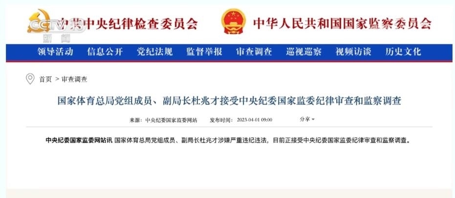 總臺央視記者 宋琎:今年3月27日,二十屆中央首輪巡視對象名單公布?!皩殷w育總局黨組開展機動巡視”這一消息迅速成為社會熱點。之后不到一周,中央紀(jì)委國家監(jiān)委通報,時任國家體育總局黨組成員、副局長杜兆才接受審查調(diào)查。體育領(lǐng)域反腐成為今年反腐敗工作的一大重點。