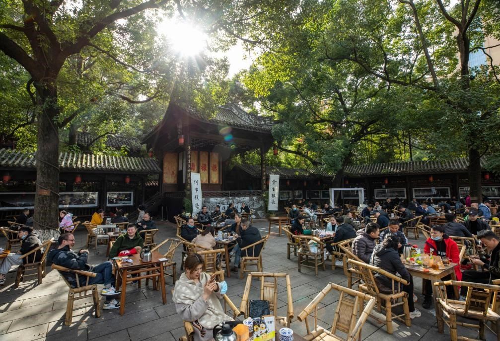 人們?cè)诔啥继爬锎蟠人聝?nèi)的茶社喝茶、休閑,不遠(yuǎn)處高樓林立