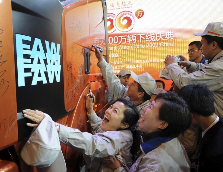 2009年10月20日,一汽解放的工人們在自己親手生產(chǎn)的2009年中國第1000萬輛車上簽名。新華社記者 蔣林 攝