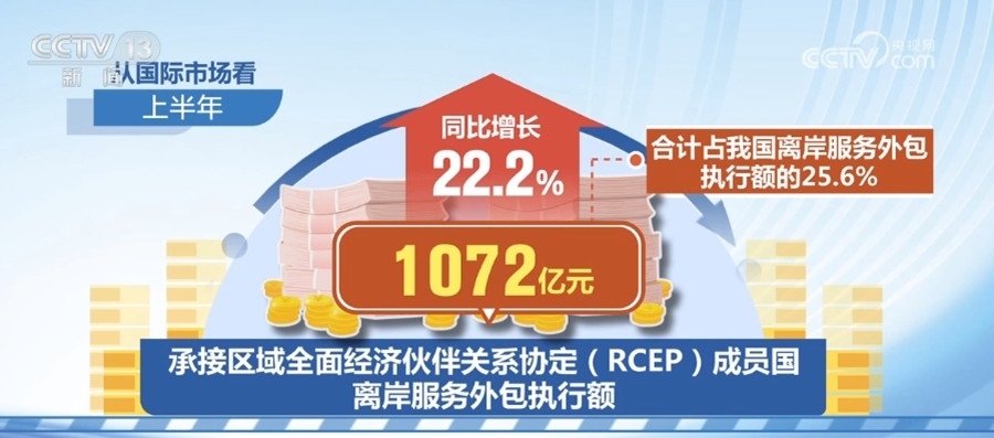 從國際市場看,上半年,承接區(qū)域全面經(jīng)濟伙伴關(guān)系協(xié)定(RCEP)成員國離岸服務(wù)外包執(zhí)行額1072億元,同比增長22.2%,合計占我國離岸服務(wù)外包執(zhí)行額的25.6%。