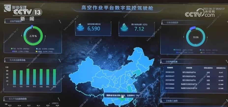 在湖南這家金融機構的大屏幕上,一個個小點組成了全國6500多臺高空作業(yè)設備的實時運行數(shù)據(jù)圖。動動手指,生產(chǎn)的每臺設備的地理位置、開機狀態(tài)和運行情況等數(shù)據(jù)都清晰可見。
