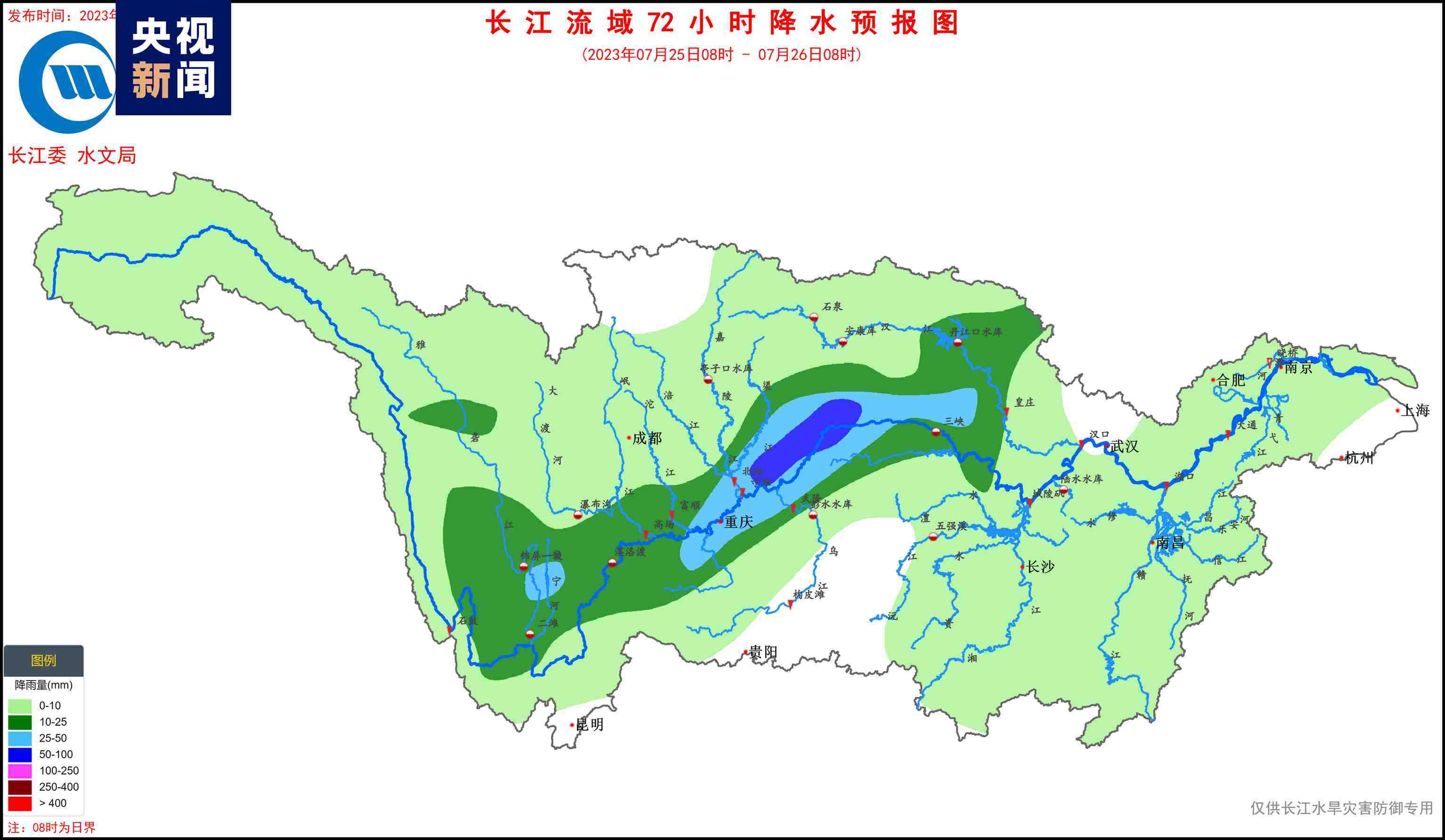 據(jù)水文氣象預(yù)報(bào),7月23日,嘉岷流域北部有中雨、局地大雨;24~27日,長(zhǎng)江上游干流附近有中到大雨、局地暴雨的降水過(guò)程,過(guò)程累計(jì)面雨量:長(zhǎng)江上游干流70毫米,金沙江中下游、雅礱江、岷沱江、渠江、烏江上游30~50毫米。考慮預(yù)見(jiàn)期降雨,金沙江中下游、嘉岷流域、赤水河、烏江、三峽區(qū)間將發(fā)生漲水過(guò)程,降雨落區(qū)內(nèi)部分中小河流可能發(fā)生超警洪水,局部強(qiáng)降雨引發(fā)山洪災(zāi)害的風(fēng)險(xiǎn)高。