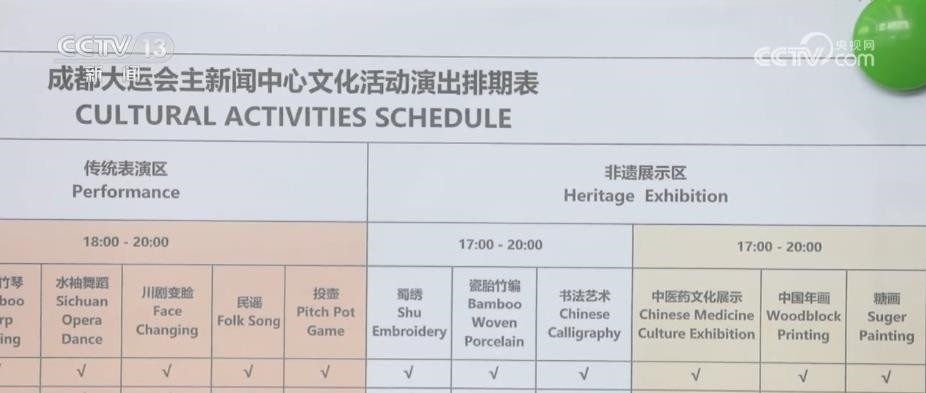 為了讓記者在繁忙的新聞報(bào)道之余,勞逸結(jié)合、舒緩身心,每天下午5時到晚間,主媒體中心都安排了豐富多彩的非遺文化活動,包括蜀錦蜀繡、川劇變臉、四川竹琴、瓷胎竹編等,讓中外記者感受獨(dú)具特色的巴蜀文化。