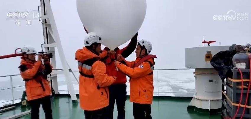 在“雪龍2”號(hào)的9層甲板,大氣環(huán)境組的科考隊(duì)員們正在為氣象探空氣球充氣,這個(gè)氣球?qū)y帶無線電探空儀,飛到兩三萬米的高空,探測大氣自下而上的溫度、濕度、氣壓、風(fēng)向、風(fēng)速等數(shù)據(jù)。