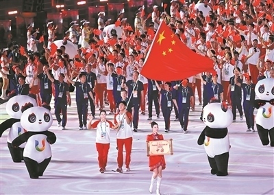 中國大學(xué)生體育代表團(tuán)運(yùn)動員及官員,在兩位旗手郭涵煜和胡朕卓的引領(lǐng)下迎面走來,全場掌聲雷動。