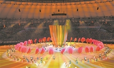 開幕式上,“太陽神鳥”穿越時空翩飛而至,4只神鳥圍繞旋轉(zhuǎn)的太陽飛翔。12道金色光芒漸次點(diǎn)亮,點(diǎn)亮了整個體育場。
