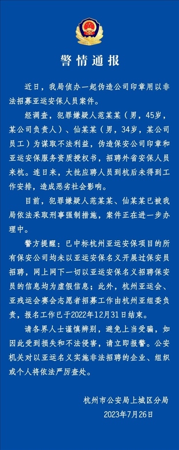·杭州警方:偽造公司印章非法招募亞運(yùn)安保人員,2人被采取刑事強(qiáng)制措施。