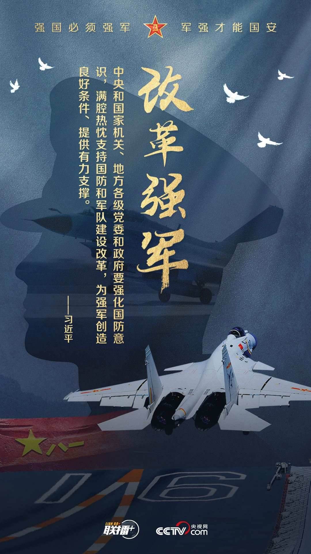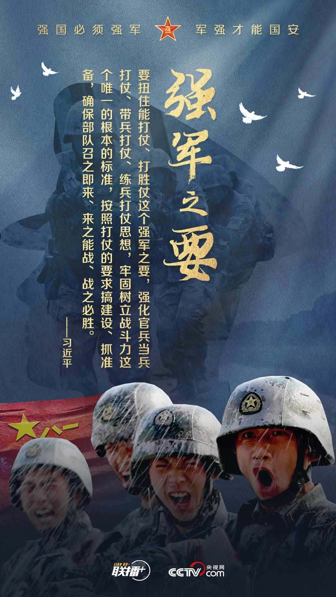 黨的十八大以來,習(xí)近平主席始終高度重視國防和軍隊建設(shè),為全軍擘畫強軍興軍藍圖、指引奮進方向。值此中國人民解放軍建軍96周年之際,央視網(wǎng)《聯(lián)播+》欄目制作強軍海報,與您一起學(xué)習(xí)習(xí)主席的強軍思想。