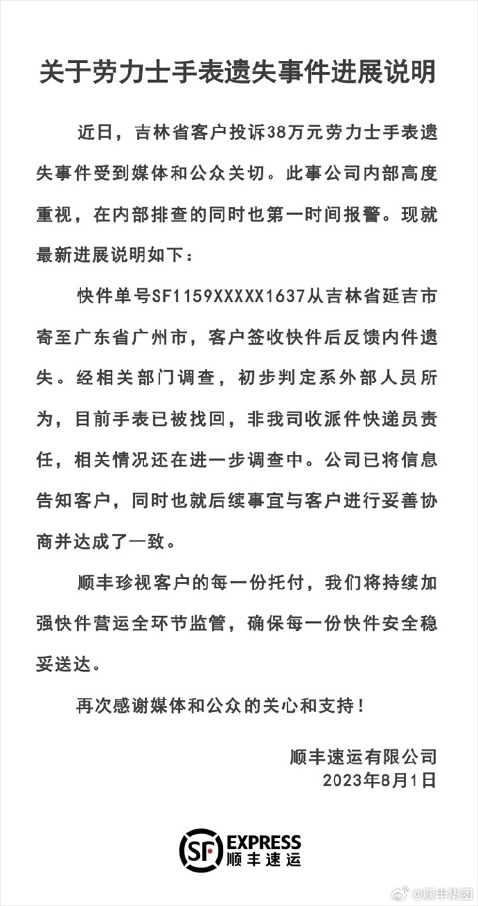 ·順豐速運回應38萬勞力士手表遺失事件:初判系外部人員所為。