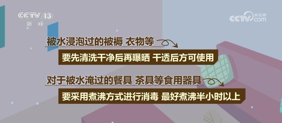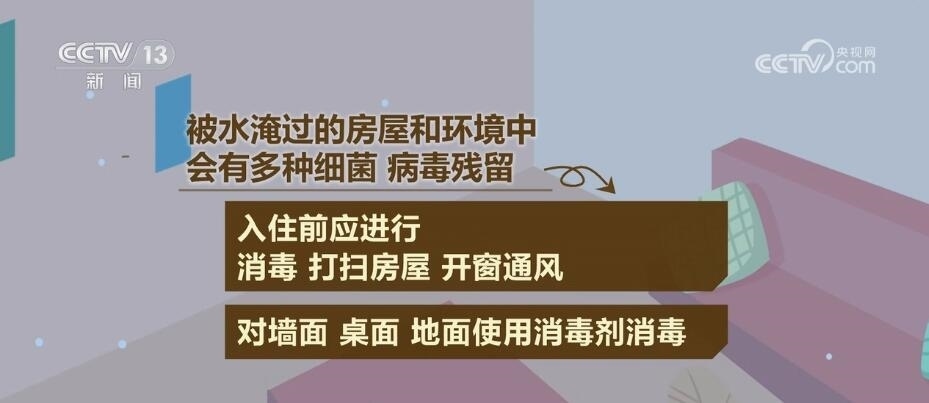 被水淹過的房屋和環(huán)境中會(huì)有多種細(xì)菌、病毒殘留,入住前應(yīng)進(jìn)行消毒,打掃房屋,開窗通風(fēng);對(duì)墻面、桌面、地面使用消毒劑消毒;被水浸泡過的被褥、衣物等,要先清洗干凈后再曝曬,干透后方可使用;對(duì)于被水淹過的餐具、茶具等食用器具,要采用煮沸方式進(jìn)行消毒,最好煮沸半小時(shí)以上。