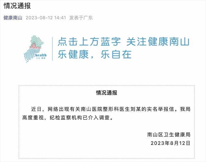·網(wǎng)傳南山醫(yī)院整形科醫(yī)生劉某被實名舉報,官方通報:紀檢監(jiān)察機構(gòu)已介入調(diào)查。