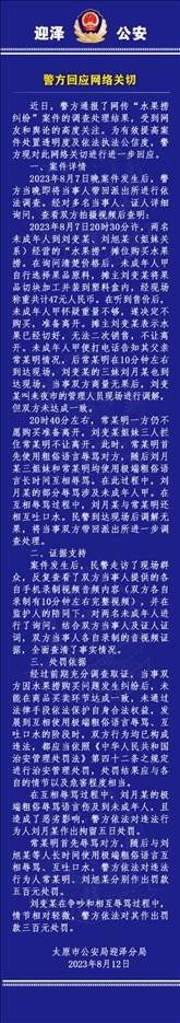 ·太原警方再通報“女生拒買水果撈被罵小三”:店方粗俗語言傷及未成年被拘留5日,家長以及另外兩名店方人員互相辱罵等被罰款。