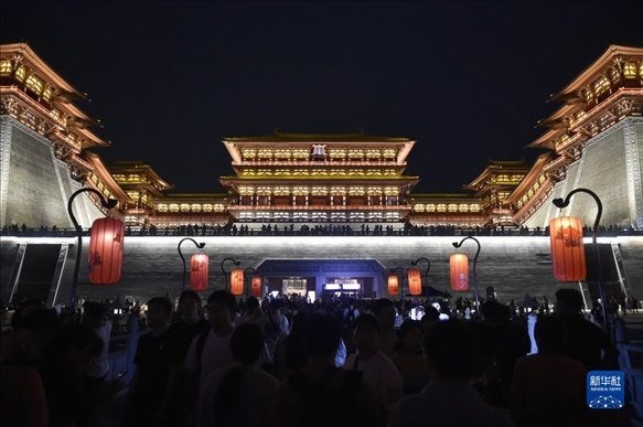 夏夜時分,河南省洛陽市隋唐洛陽城國家遺址公園應天門遺址博物館燈火輝煌,熱鬧非凡,滿目的人間煙火再現(xiàn)千年古都繁華盛景。