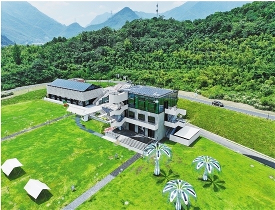 圖為余村未來圖書館,該建筑主要通過鋪設在屋頂上的光伏發(fā)電系統(tǒng)和“光伏樹”供電(無人機照片)。新華社記者 翁忻旸 攝
