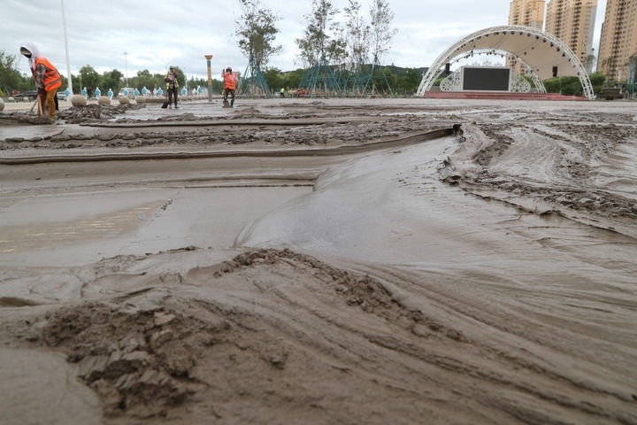 8月11日,在黑龍江省尚志市尚志大街附近,環(huán)衛(wèi)工人在清理淤泥。新華社記者 張濤 攝