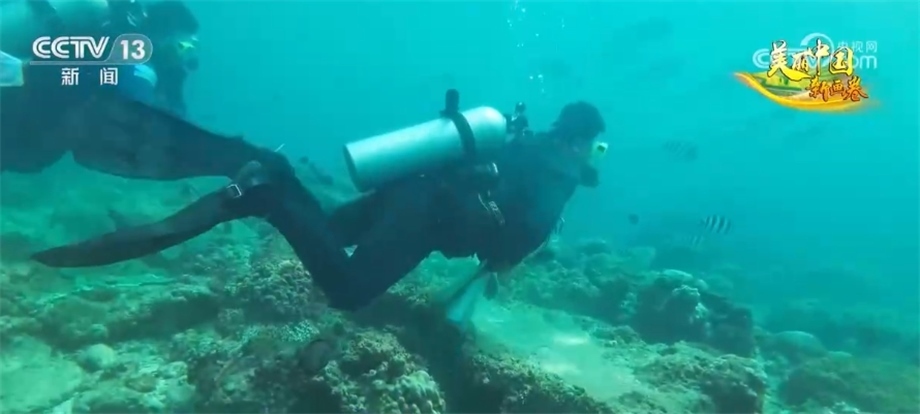 總臺(tái)央視記者 焦健:我現(xiàn)在位于海南三亞蜈支洲島,在我身旁的這片海域就是我國(guó)的第一個(gè)熱帶海洋牧場(chǎng)。這段時(shí)間,海洋牧場(chǎng)正在進(jìn)行珊瑚移植和調(diào)裝魚礁的工作。我們帶著水下攝像機(jī),跟隨著工作人員一起進(jìn)入海底,體驗(yàn)在海里如何“植樹造林”。
