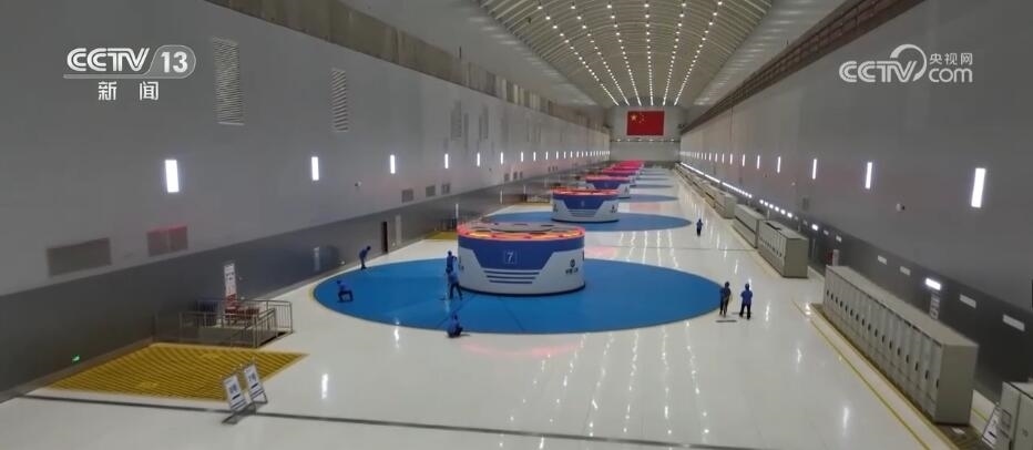 我現(xiàn)在就在白鶴灘水電站的左岸地下廠房,在我身后一字排開的,就是處于全發(fā)狀態(tài)當(dāng)中的百萬千瓦水輪發(fā)電機組。站在這兒,我其實只能看到它冒出地面的3米,而在我腳下還有51米,單臺機組的總重量接近8000噸。之所以讓它成為世界級的先進(jìn)的水輪發(fā)電機組,除了它的這種大體量和大功率之外,更重要的是在研發(fā)階段解決了許多世界級的難題。比如,它所克服的特殊工況下的壓力脈動,就能夠讓整臺機組在運行的時候更加的安全、穩(wěn)定。再比如說,在機組高速運轉(zhuǎn)的過程當(dāng)中,對于平穩(wěn)性的要求近乎于苛刻,我現(xiàn)在就站在機組的頂板上,在地面上立了幾枚硬幣,它們現(xiàn)在是穩(wěn)穩(wěn)地立在這兒,但是如果我輕輕的施加外力,它就會傾倒,看得出來它的平穩(wěn)性。而正是一代又一代的中國水電人的不斷努力,才實現(xiàn)了水輪發(fā)電機組從跟跑到并跑到超越的發(fā)展速度。鑄造出了這樣的國之重器。