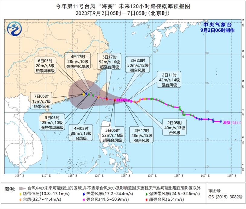 大風(fēng)預(yù)報:9月2日08時至3日08時,受“蘇拉”影響,南海西北部、北部灣東部、瓊州海峽及廣東沿海、廣西南部沿海、珠江口以及香港和澳門等地將有7-9級、陣風(fēng)10-11級的大風(fēng),“蘇拉”中心經(jīng)過的附近海面或地區(qū)風(fēng)力有12-13級、陣風(fēng)14-15級;受“??庇绊?,臺灣海峽、浙江南部沿海、福建沿海、廣東東部沿海、臺灣島沿海將有6-7級,陣風(fēng)8級大風(fēng),臺灣以東洋面部分海域風(fēng)力可達(dá)8-10級,陣風(fēng)11-12級,“??敝行慕?jīng)過的附近海面風(fēng)力可達(dá)12-13級,陣風(fēng)14級。