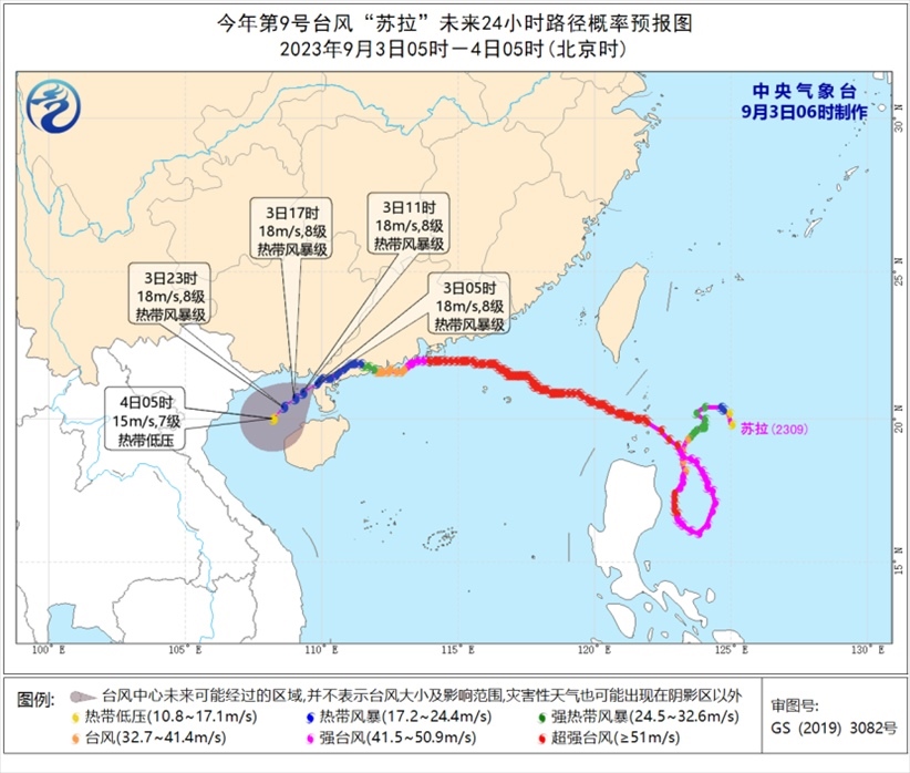 降水預(yù)報(bào):9月3日08時(shí)至4日08時(shí),受“蘇拉”和“海葵”影響,廣西中南部、廣東西南部、臺(tái)灣島等地部分地區(qū)有大到暴雨,其中,廣西中南部、臺(tái)灣島中東部等地部分地區(qū)有大暴雨,臺(tái)灣島東部部分地區(qū)有特大暴雨(250-600毫米)。