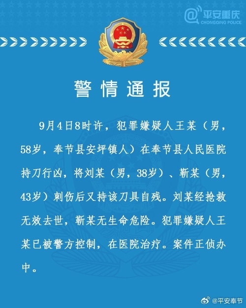 ·重慶奉節(jié)一男子在醫(yī)院持刀行兇致一死一傷,警方通報(bào)。