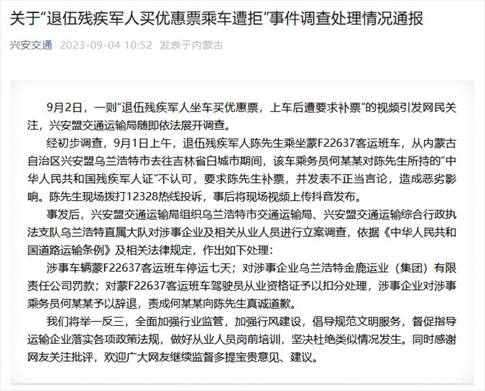 ·興安盟交通運(yùn)輸局通報(bào)“退伍殘疾軍人買優(yōu)惠票乘車遭拒”:涉事乘務(wù)員被辭退。