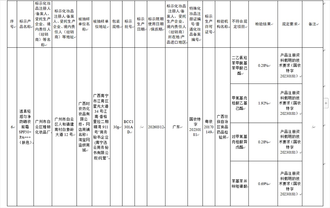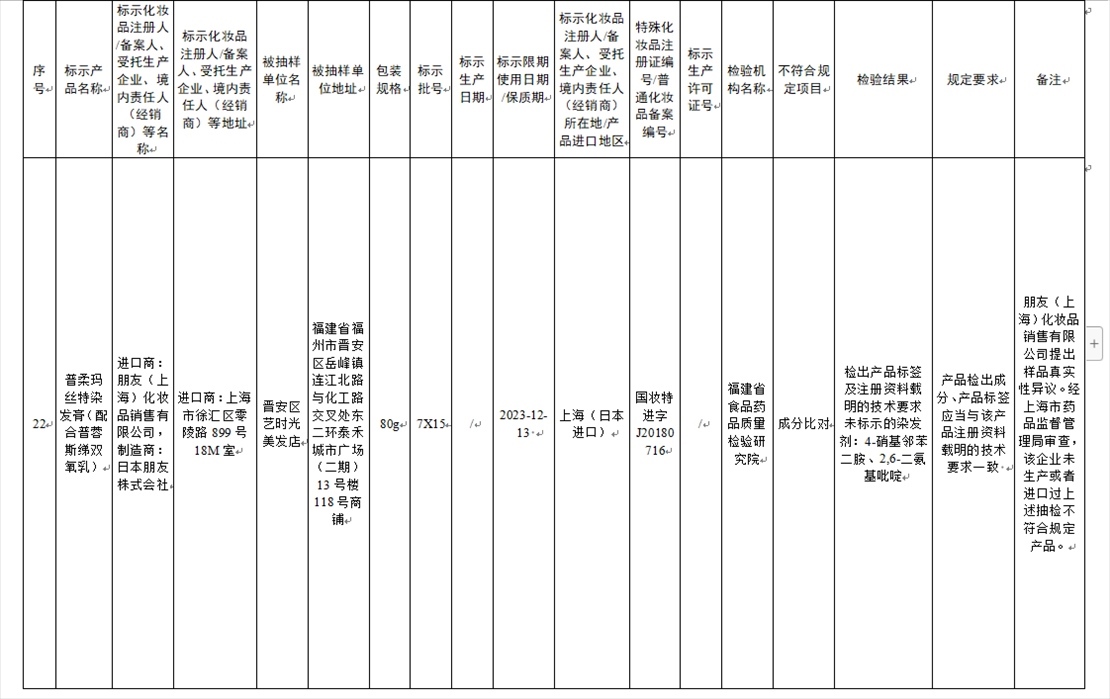 國(guó)家藥監(jiān)局網(wǎng)站今天發(fā)布通告稱,在2023年國(guó)家化妝品抽樣檢驗(yàn)工作中,經(jīng)重慶市食品藥品檢驗(yàn)檢測(cè)研究院等單位檢驗(yàn),產(chǎn)品標(biāo)簽標(biāo)示為廣州市天科化妝品有限公司生產(chǎn)的天科染發(fā)膏(自然黑)等23批次化妝品不符合規(guī)定(見下圖表格)。