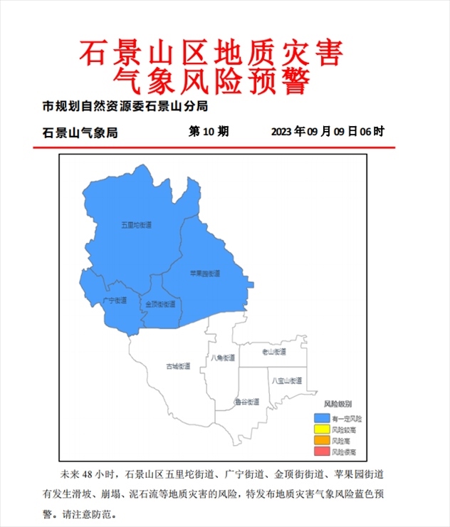 石景山區(qū)五里坨街道、廣寧街道、金頂街街道、蘋(píng)果園街道有發(fā)生滑坡、崩塌、泥石流等地質(zhì)災(zāi)害的風(fēng)險(xiǎn),特發(fā)布地質(zhì)災(zāi)害氣象風(fēng)險(xiǎn)藍(lán)色預(yù)警。請(qǐng)注意防范。