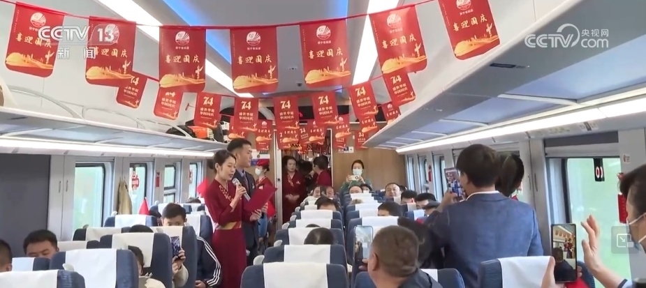 車廂內(nèi)掛滿了國慶主題的旗幟、窗花,“天路格?;ā蔽乃囆》株爴]動著手中的五星紅旗,與旅客齊聲合唱《我和我的祖國》,還表演了詩朗誦、快板等節(jié)目,贏得了現(xiàn)場旅客的掌聲。