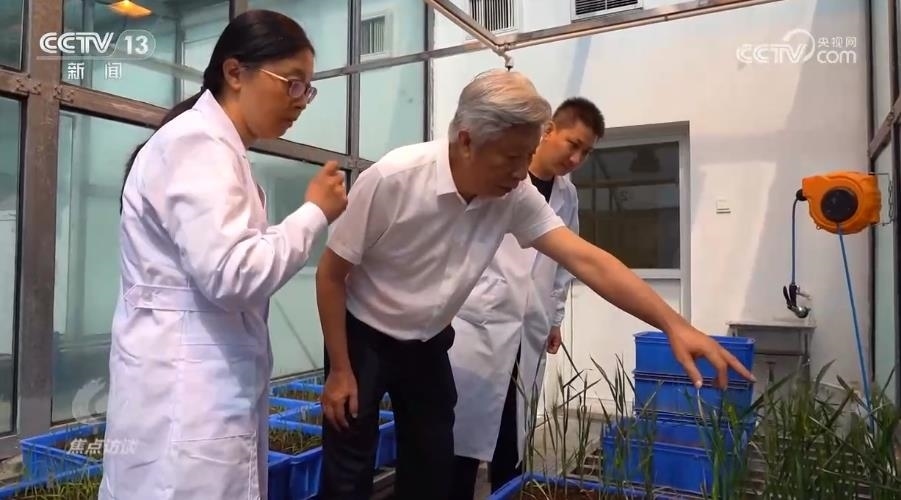 在河南省農(nóng)業(yè)科學(xué)院的玻璃溫室,50株剛剛破土一個月的小麥新品種幼苗長勢不錯。小麥品種的培育者——小麥育種專家許為鋼院士帶著團(tuán)隊(duì)細(xì)心地查看這些幼苗。
