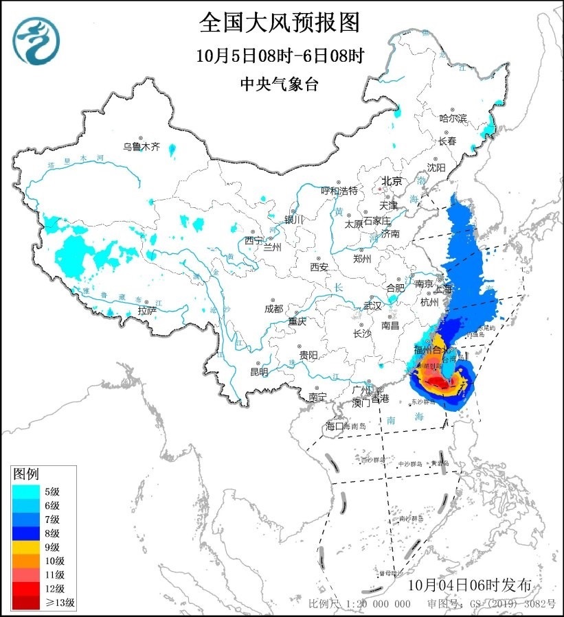 10月5日08時(shí)至6日08時(shí),東海西南部海域、臺(tái)灣海峽、臺(tái)灣以東洋面、巴士海峽、南海東北部偏北海域?qū)⒂?~9級(jí)、陣風(fēng)10~11級(jí)的大風(fēng),其中臺(tái)灣海峽、臺(tái)灣以東洋面、巴士海峽的部分海域風(fēng)力可達(dá)10~12級(jí)、陣風(fēng)13~14級(jí),臺(tái)風(fēng)“小犬”中心經(jīng)過的附近海域風(fēng)力可達(dá)13~14級(jí)、陣風(fēng)15~16級(jí),黃海東部海域、東海西北部海域?qū)⒂?級(jí)、陣風(fēng)8級(jí)的大風(fēng);西藏西部將有5~6級(jí)、陣風(fēng)7級(jí)的大風(fēng),浙江沿海、福建沿海、臺(tái)灣島將有6~8級(jí)、陣風(fēng)9級(jí)的大風(fēng)。