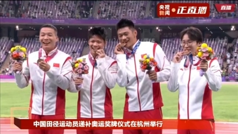 10月4日晚,杭州亞運(yùn)會(huì)田徑比賽結(jié)束后,中國奧委會(huì)在杭州奧體中心體育場舉行遞補(bǔ)奧運(yùn)獎(jiǎng)牌頒獎(jiǎng)儀式。