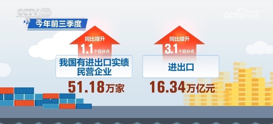 2023年前三季度,我國有進(jìn)出口實(shí)績的民營企業(yè)51.18萬家,進(jìn)出口16.34萬億元,分別占整體的85.7%、53.1%,同比分別提升1.1個(gè)、3.1個(gè)百分點(diǎn)。