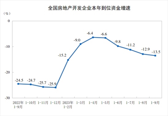 1—9月份,房地產(chǎn)開發(fā)企業(yè)到位資金98067億元,同比下降13.5%。其中,國(guó)內(nèi)貸款12100億元,下降11.1%;利用外資36億元,下降40.0%;自籌資金31252億元,下降21.8%;定金及預(yù)收款33631億元,下降9.6%;個(gè)人按揭貸款17028億元,下降6.9%。