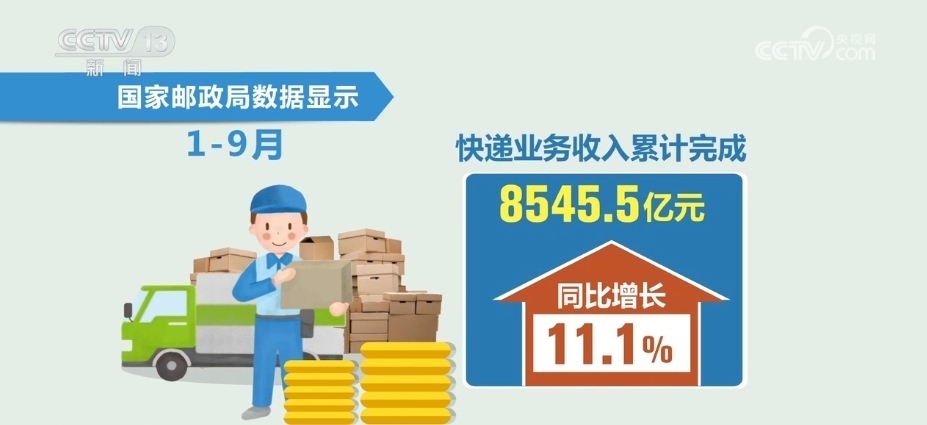 此外,1—9月,全國郵政行業(yè)業(yè)務(wù)收入(不包括郵政儲蓄銀行直接營業(yè)收入)累計完成11013.3億元,同比增長10.7%。其中,快遞業(yè)務(wù)收入累計完成8545.5億元,同比增長11.1%。