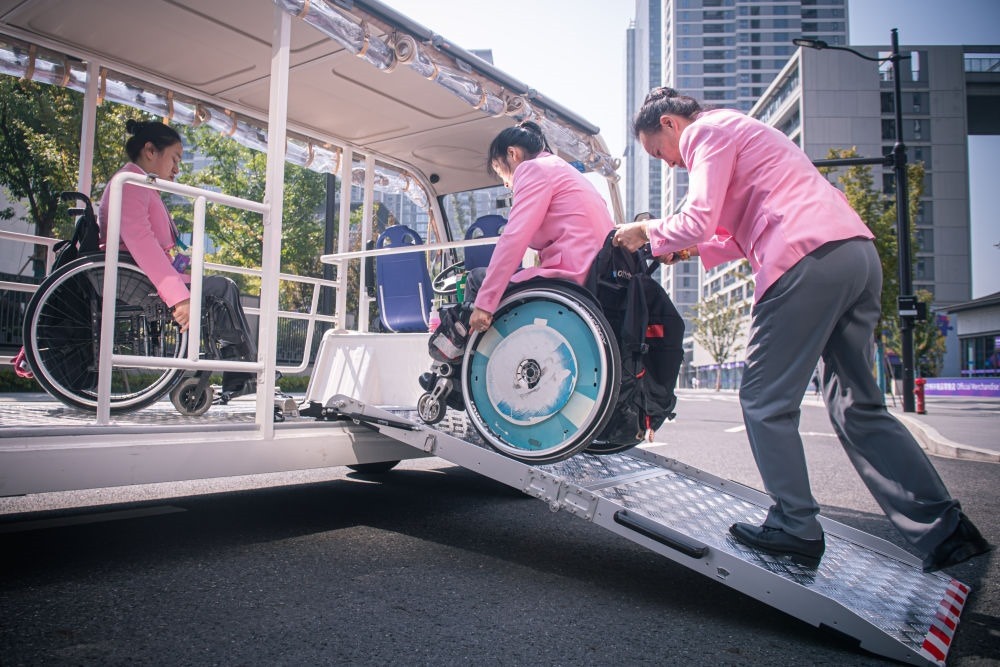 10月16日,中國體育代表團(tuán)成員在杭州亞殘運村內(nèi)乘坐無障礙接駁車出行。新華社記者 江漢 攝