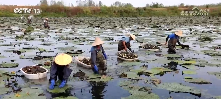 在安徽霍邱縣宋店鎮(zhèn)小路芡實種植家庭農(nóng)場,十幾名工人正在水中采摘芡實。