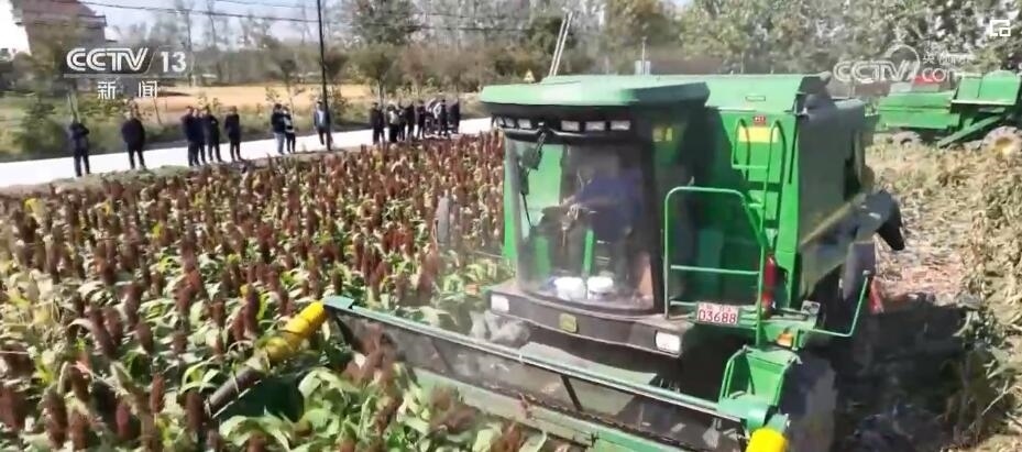 在江蘇灌南,萬(wàn)畝高粱開(kāi)鐮收割。一臺(tái)臺(tái)大型收割機(jī)將粒粒高粱收入囊中。